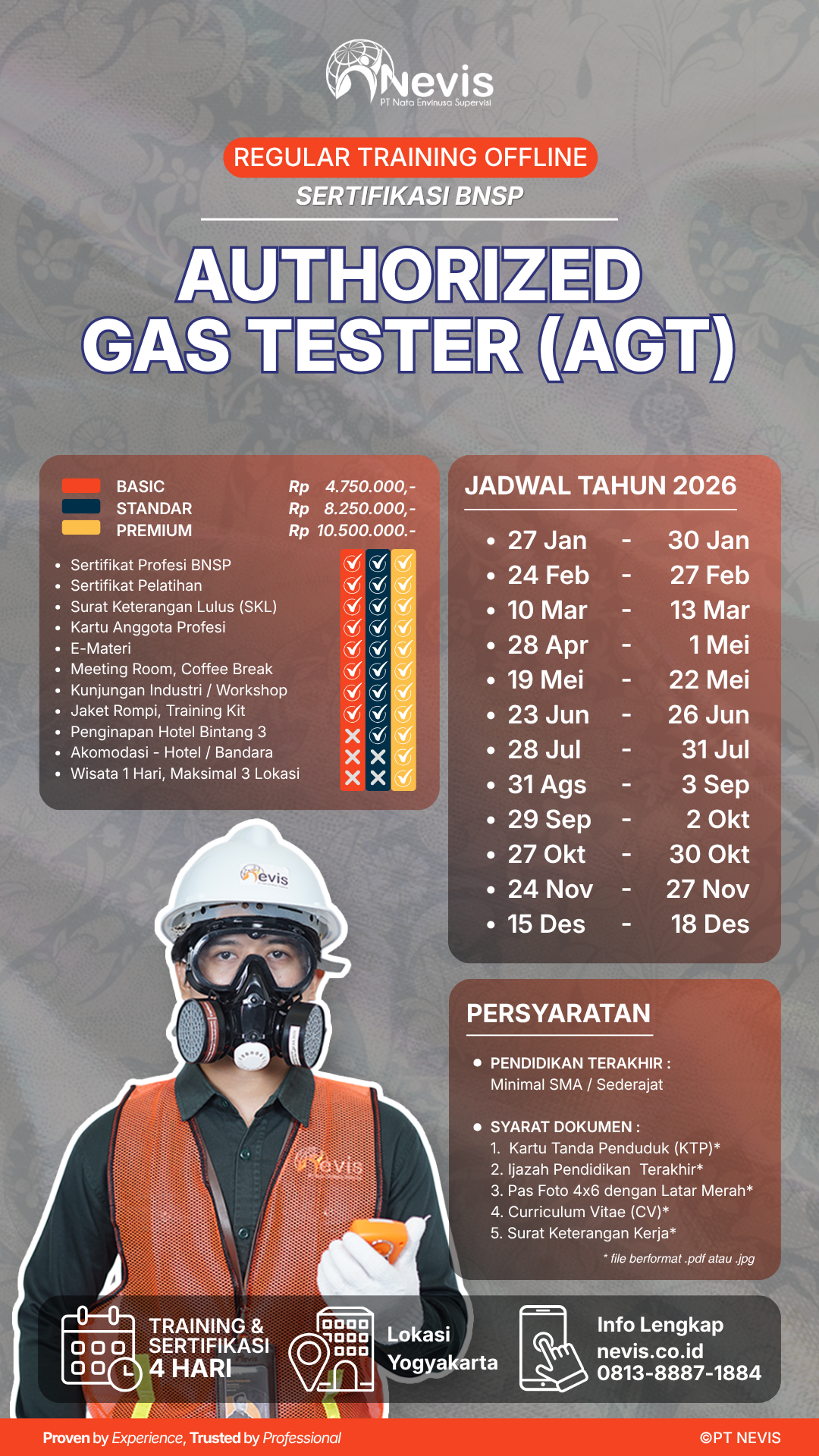 Training Authorized Gas Tester (AGT) Sertifikasi BNSP dirancang untuk memberikan pengetahuan dan keterampilan yang diperlukan bagi karyawan, pegawai, pekerja profesional yang ingin kompeten dan bersertifikat profesi di bidang Keselamatan dan Kesehatan Kerja (K3) pada lingkungan kerja yang berpotensi terkena risiko gas berbahaya. Pelatihan ini diselenggarakan oleh PT Nata Envinusa Supervisi (PT NEVIS) Departemen Academy sebagai Tempat Uji Kompetensi (TUK) yang berlisensi secara Offline atau Tatap Muka di Ruang Training Hotel area Kota Yogyakarta.