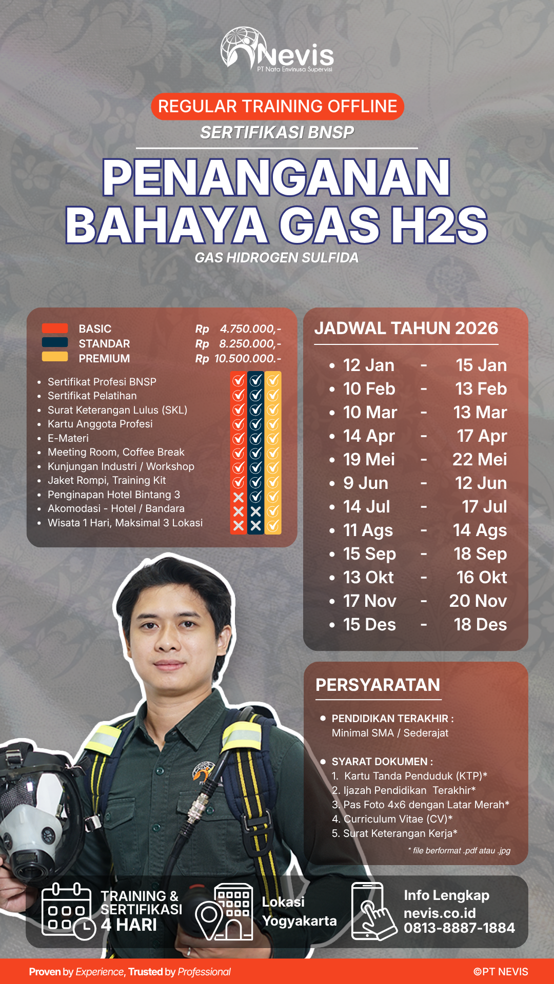 Training Penanganan Bahaya Gas Hidrogen Sulfida (H2S) Sertifikasi BNSP dirancang untuk memberikan pengetahuan dan keterampilan yang diperlukan bagi karyawan, pegawai, pekerja profesional yang ingin kompeten dan bersertifikat profesi di bidang Keselamatan dan Kesehatan Kerja (K3). Pelatihan ini diselenggarakan oleh PT Nata Envinusa Supervisi (PT NEVIS) Departemen Academy sebagai Tempat Uji Kompetensi (TUK) yang berlisensi secara Offline atau Tatap Muka di Ruang Training Hotel area Kota Yogyakarta.