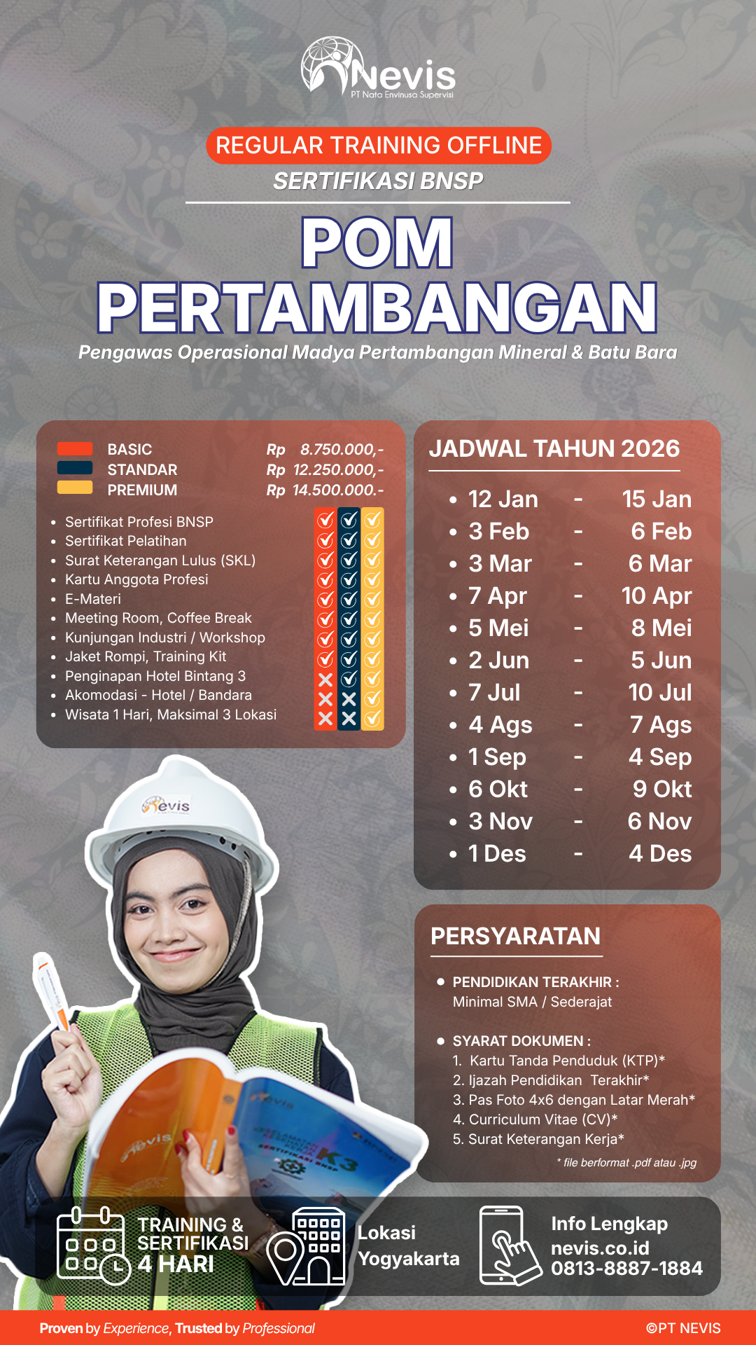 Training Pengawas Operasional Madya (POM) Pertambangan Sertifikasi BNSP dirancang untuk memberikan pengetahuan dan keterampilan yang diperlukan bagi karyawan, pegawai, pekerja profesional yang kompeten dan bersertifikat profesi di bidang Pertambangan Mineral dan Batu Bara (MINERBA). Pelatihan ini diselenggarakan oleh PT Nata Envinusa Supervisi (PT NEVIS) Departemen Academy sebagai Tempat Uji Kompetensi (TUK) yang berlisensi secara Offline atau Tatap Muka di Ruang Training Hotel area Kota Yogyakarta.